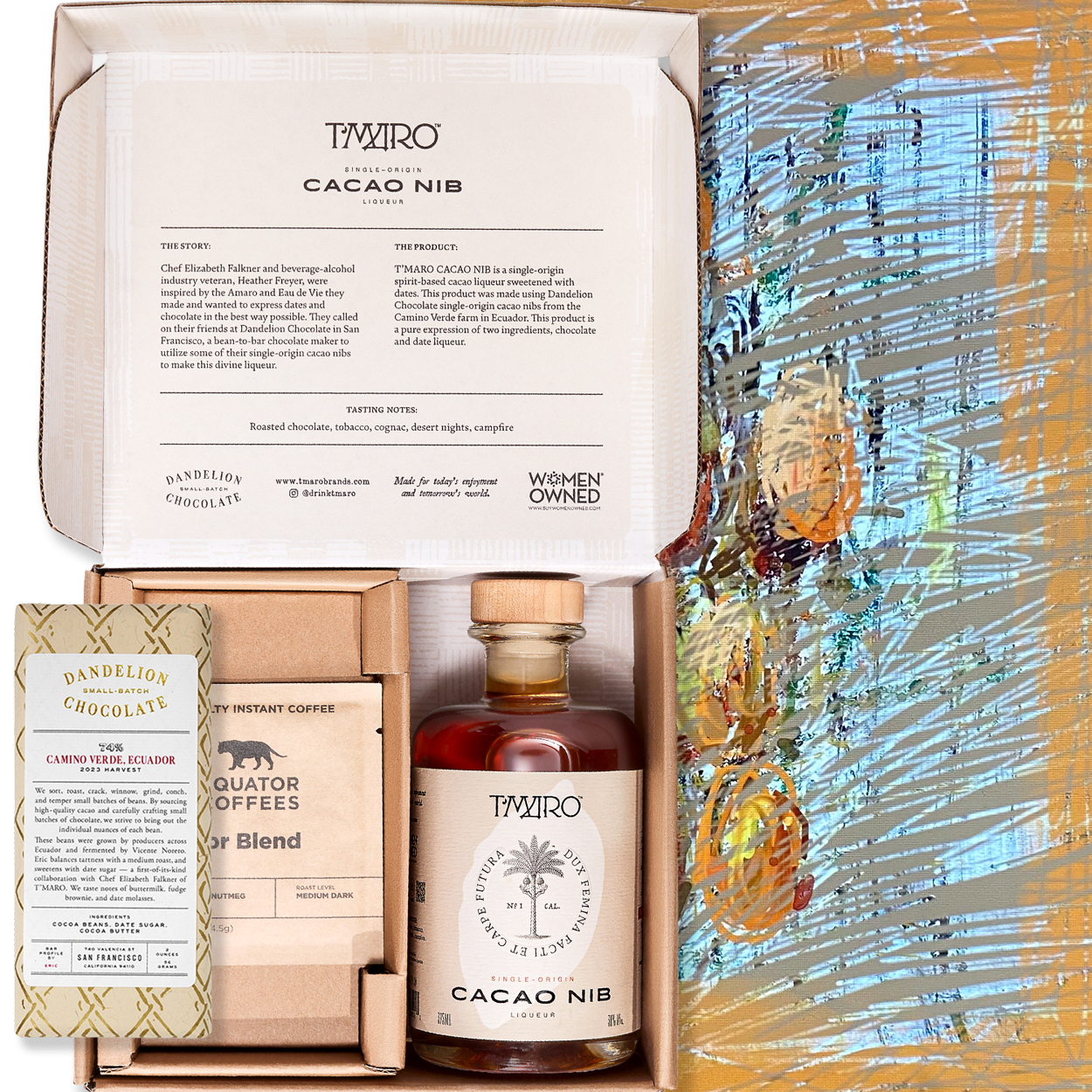 This kit includes an innovative chocolate bar with the same cacao from the Camino Verde Estate in Ecuador, sweetened only with dates. It is a pure expression of cacao and date in one format. This is the best of both. We've included Equator instant espresso to make a fun cocktail; the Cacao Carajillo. Our gift box contains two products made from two ingredients; cacao and dates. T'MARO liqueur and the chocolate bar are made from 100% organic dates, single origin cacao nibs and only sweetened by dates. Vicente Norero, the owner and general manager of Camino Verde Cacao, is one of the most innovative cacao producers and he is always improving through his continual experimentation. Our dates come from a CCOF certified farm that utilizes drip irrigation, the most water-saving method available from the Coachella Valley, California. T’MARO Cacao is made with 100% organic dates, single origin cacao nibs and only sweetened by dates.